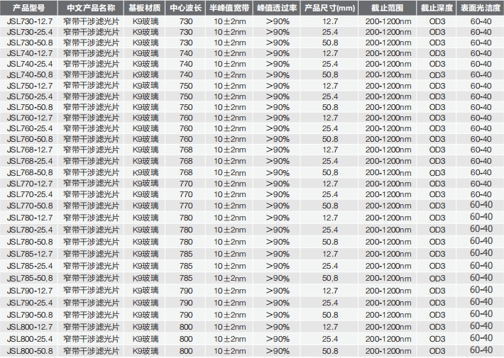 JSL系列窄带干涉滤光片(Narrow Bandpass Interference Filters):