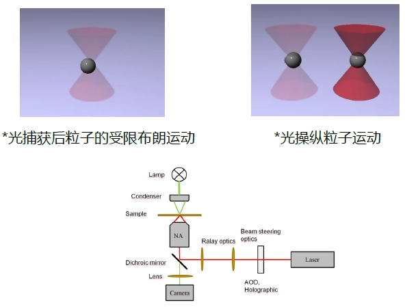 光镊原理:采用100kHz AOD(声光偏转器)高速分时扫描不同位置,从而形成多个光阱;