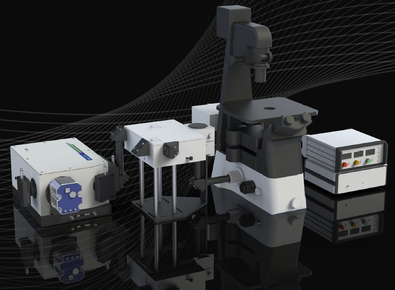 结构二:在卓立汉光自主研制的标准RTS显微共聚焦拉曼光谱仪的基础上配置具有双层无限远光路的倒置显微镜,上层光路多光阱光镊系统,拉曼激光从显微镜的侧口进入,拉曼信号原路返回接光谱仪,可内置不同波长激光器,也可外部耦合激光器,拉曼信号通过光纤或者空间光路耦合到光谱仪,光路如下: