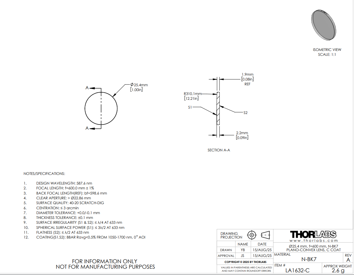 Thorlabs索雷博 LA1632-C 平凸透镜
