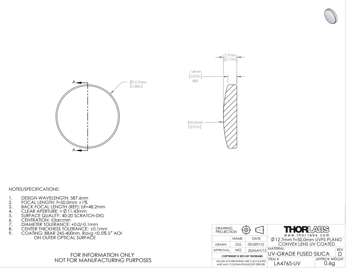 Thorlabs索雷博 LA4765-UV 平凸透镜