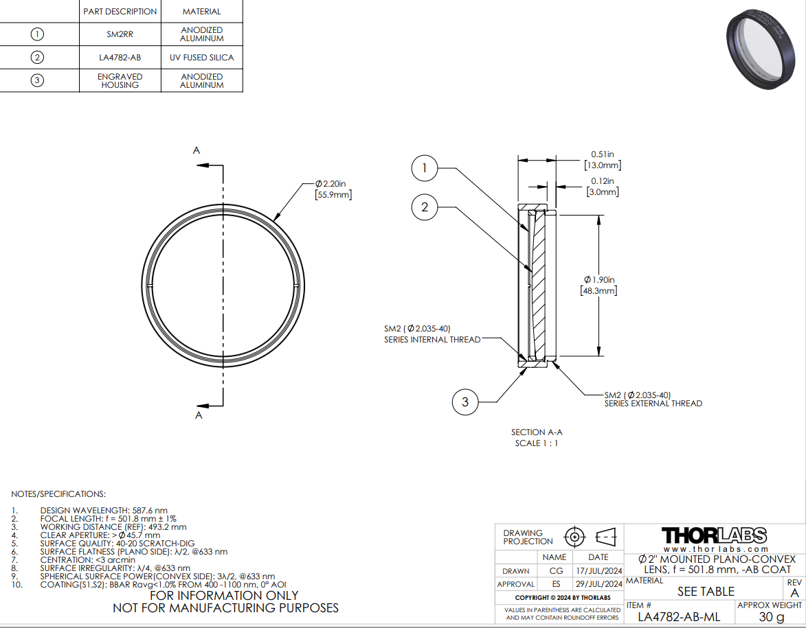 - 提供Ø1/2英寸、Ø1英寸、Ø2英寸和Ø75 mm透镜,带SM螺纹安装座
