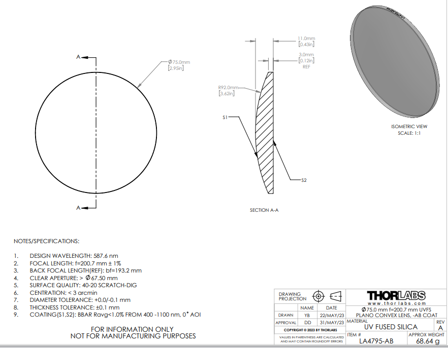 其中,n是折射率,好的是透镜表面的曲率半径。这些透镜由阿贝数为67.82的紫外级熔融石英制成;阿贝数是色散指标。