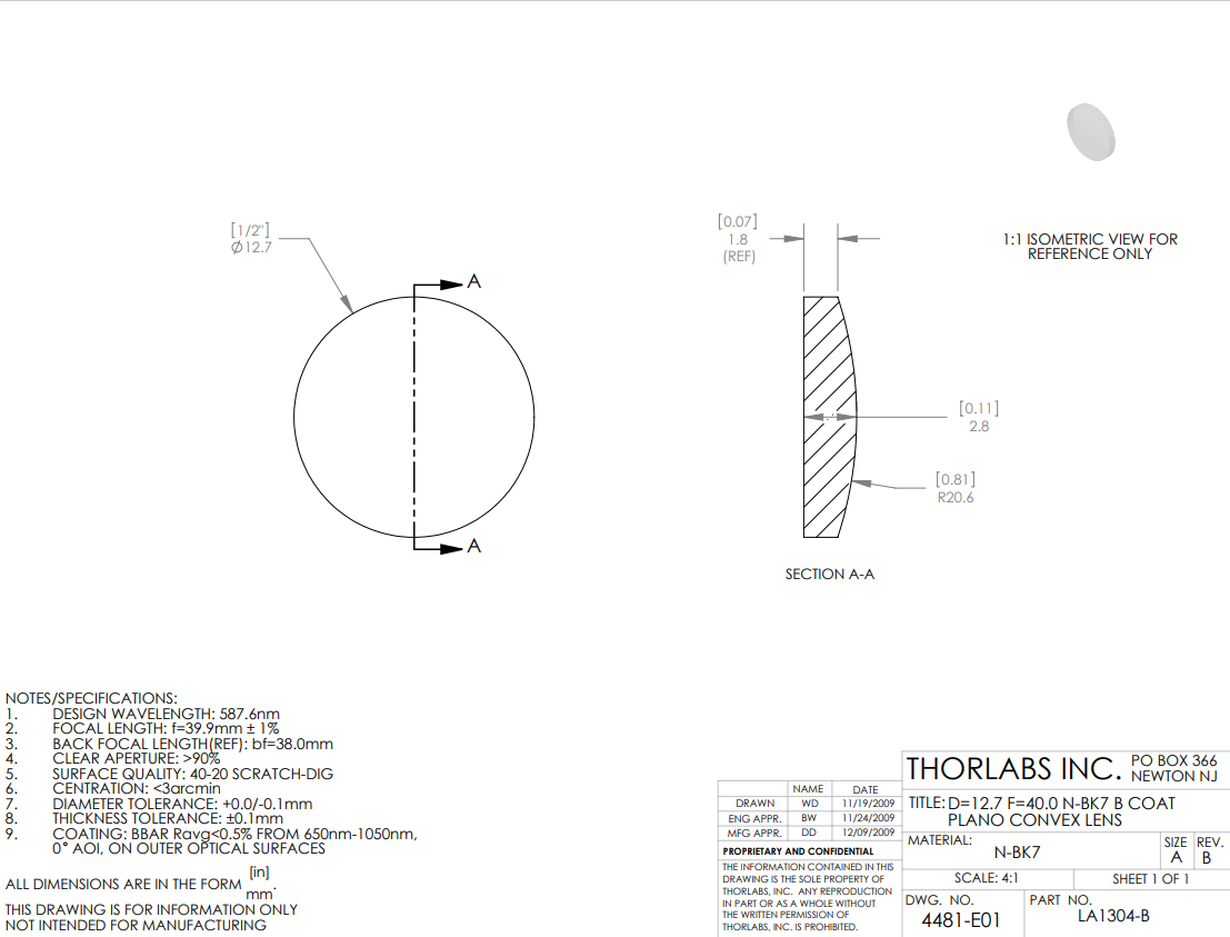其中n是折射率,R是透镜表面的曲率半径。这些透镜使用阿贝数为64.17的N-BK7材料生产;阿贝数是色散指标。