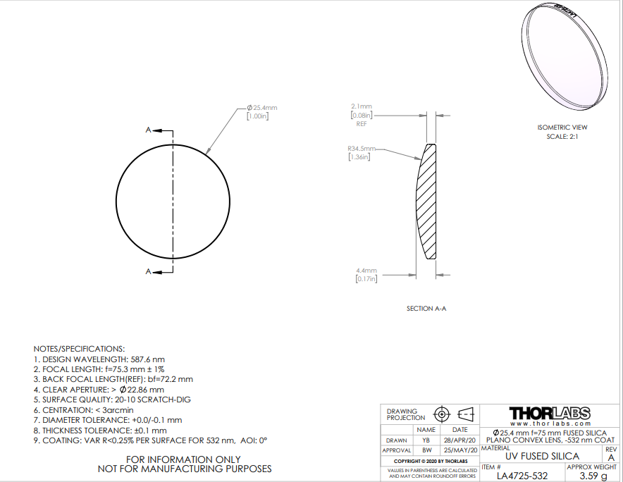 Thorlabs索雷博 LA4725-532 紫外熔融石英平凸球透镜