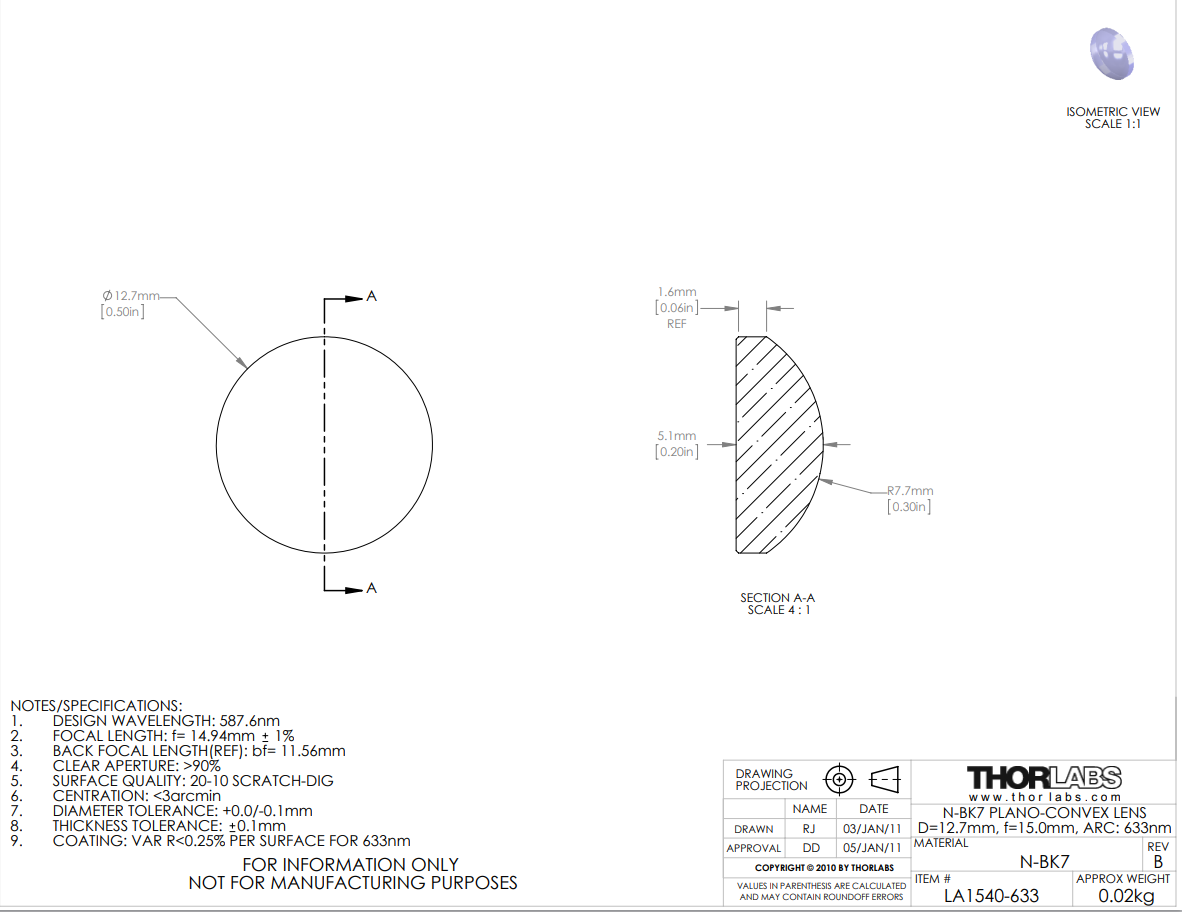 为了最小化引入的球差,在聚焦准直光束时应使其入射到透镜曲面上,而在准直点光源发出的光束时应使其入射到透镜平面上。透镜焦距可用厚透镜简化公式f=R/(n-1)计算,其中n是折射率,R是透镜凸面曲率半径。这种透镜采用N-BK7玻璃制造,阿贝数为64.17。阿贝数表征的是色散的大小。