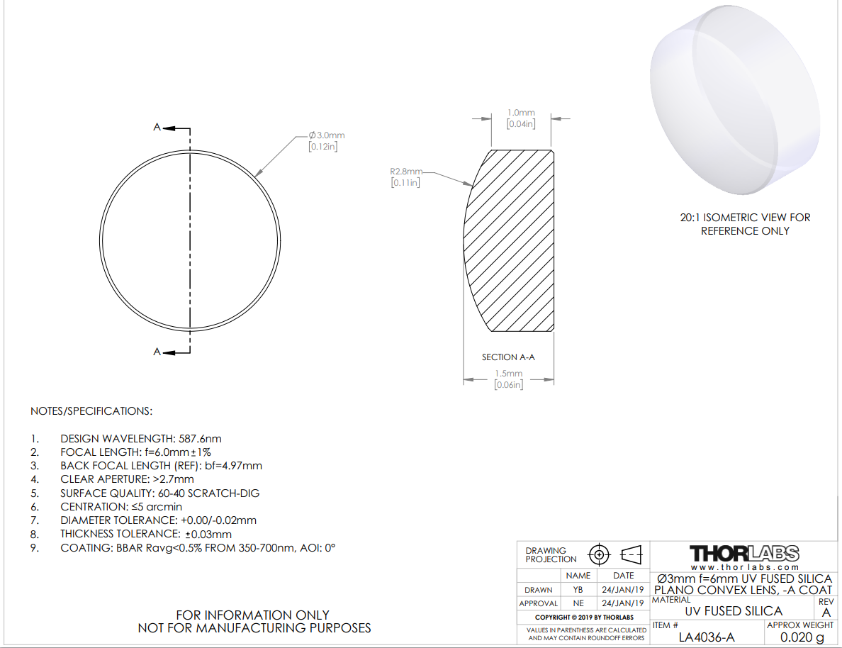Thorlabs索雷博 LA4036-A 平凸透镜