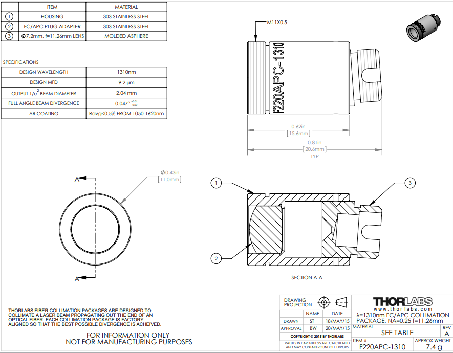 Thorlabs索雷博 F220APC-1310 光纤准直器
