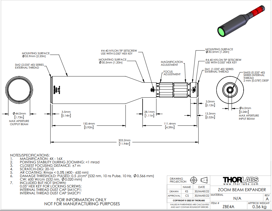Thorlabs索雷博 ZBE4A 变焦扩束器