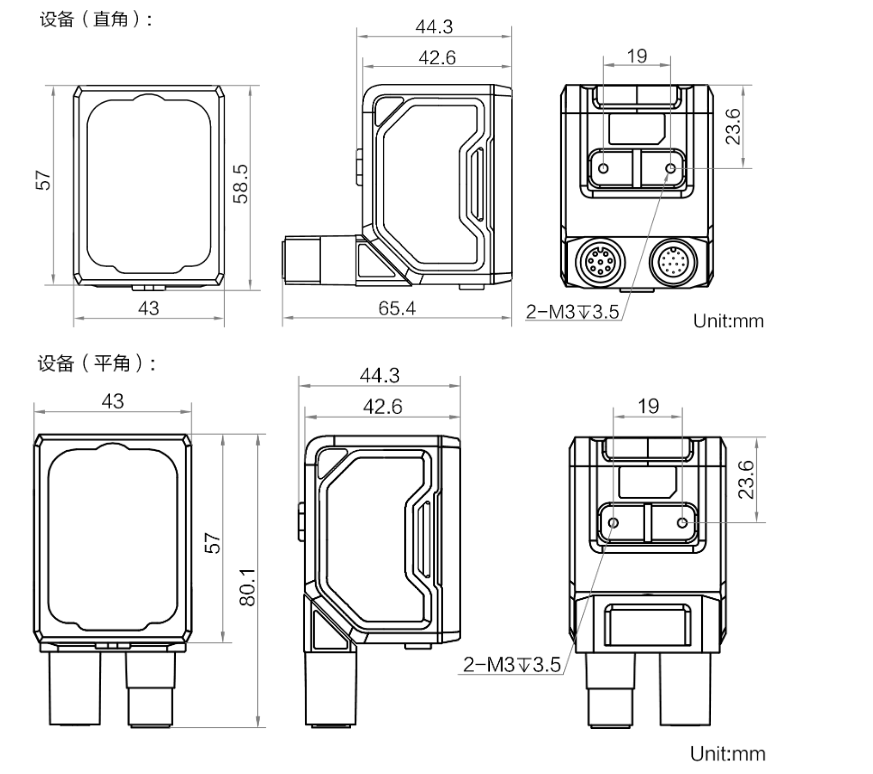 外形尺寸 | 平角:80.1 mm × 43 mm × 44.3 mm 直角:58.5 mm × 43 mm × 65.4 mm |