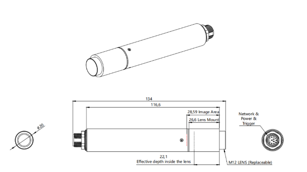 φ20x116,6mm(不含后端接口尺寸,含一个M12镜头--物距约100mm,视野大小15.8x7mm)
