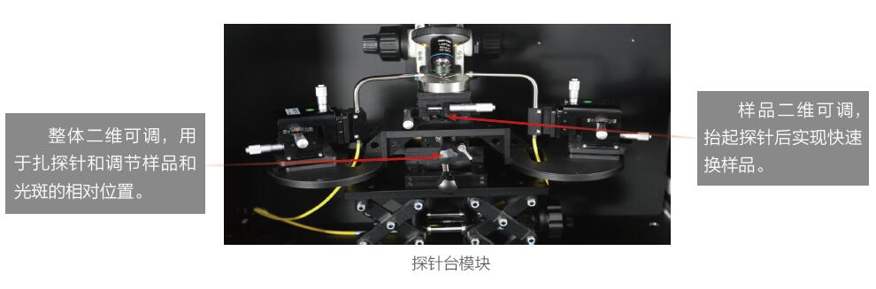 探针台模块 | 直径65mm真空吸附卡盘 探针座和样品整体二维移动,方便样品位置与光斑位置重合 样品位置单独二维移动,方便同类样品更换 样品位置移动行程25mm,分辨率5μm 探针座:XYZ行程12mm,分辨率0.7μm 探针:钨针,直径5μm,10μm,20μm可选 |