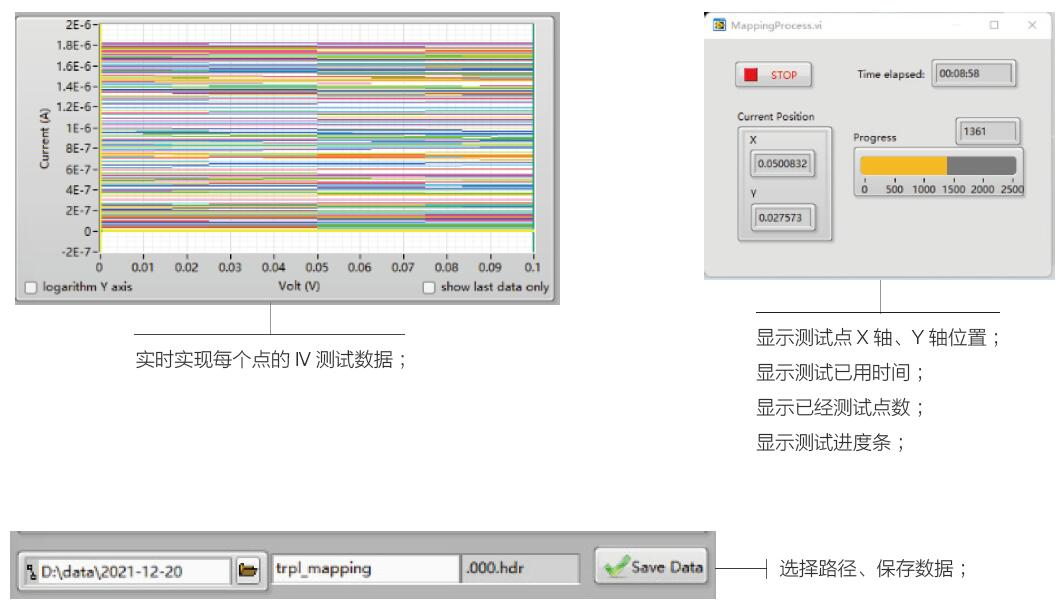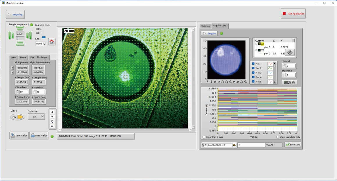 软件 | 光电流扫描(Mapping):可以设定固定的电压,逐点获取电流值 I-V曲线扫描(Mapping):可以设定指定的电压区间,逐点获取I-V曲线 指定区域扫描(Mapping) |