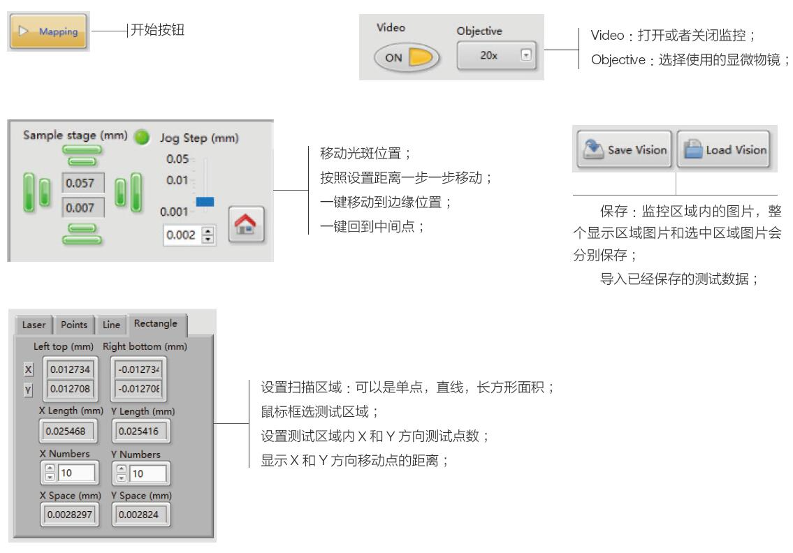 显微镜模块 | 反射式/透射式LED照明 物镜:标配(20X, WD=7.5mm) 超长工作距离 最大扫描范围:260 x 200 μm (20x物镜下) 位置重复性:小于1 μm 最小扫描步长:0.2μm 步长可选范围:0.2-30μm 激光光斑:2μm |