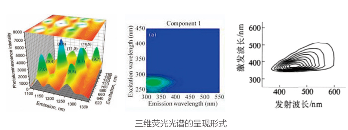 三维荧光光谱的呈现形式如右图所示,左图为三维荧光光谱数据的三维立体图形,中间图形为三维荧光光谱的Z轴投影,右图为三维荧光光谱的等高线图形。