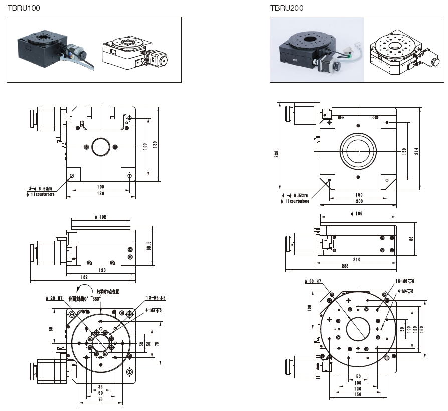 TBRU 系列产品是卓立汉光为解决全闭环使用、高重复性、高精密性而开发的高精密闭环电动旋转滑台。导向机构采用精密交叉滚柱轴环,轴系结构采用耐磨的精研蜗轮蜗杆,蜗杆材质为合金结构钢,经过高频淬火处理,硬度高,刚性好,蜗轮材质选用锡青铜,具有突出的耐磨性。主体采用硬质铝合金,表面黑色阳极氧化处理,外形美观。保证了高旋转精度,轴向跳动、同心度等关键指标达到国际同类产品水平。特有的蜗轮蜗杆调整机构,有效的消除了机械误差并保证长期使用精度。该系列产品具有较高的负载能力,可用于竖直及倒置使用。
