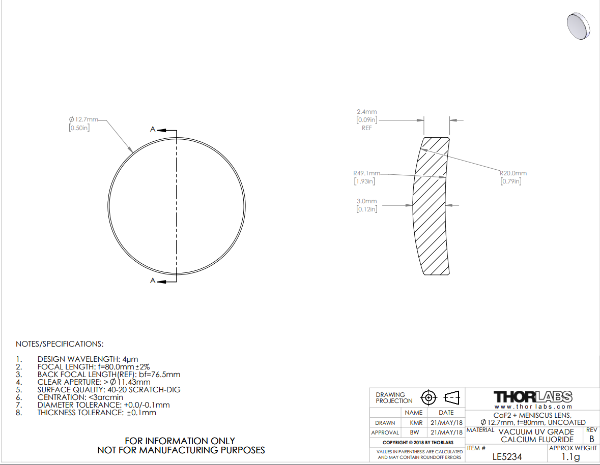 Thorlabs Ø1/2英寸和Ø1英寸的氟化钙(CaF2)正弯月透镜,在0.18-8.0 μm的波长范围内都有很高的透过率,本页中介绍的是未镀膜的版本,也可以选择镀有2 - 5 μm增透膜的版本。