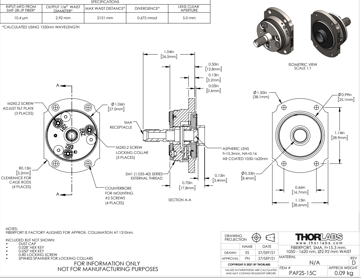 Thorlabs索雷博 PAF2S-15C 带非球面透镜