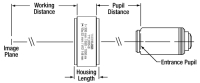 图2.2 TTL系列和ITL200系列套筒透镜的工作距离和瞳距示意图。工作距离是指外壳上表面到像平面的距离。瞳距定义为套筒透镜外壳下边缘到物镜入射光瞳的距离,可设置在上表指定范围内的任意位置,因为物镜输出的是平行光束。如果套筒透镜太近太远,图像可能产生像差。