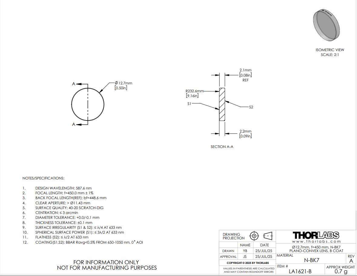 其中n是折射率,R是透镜表面的曲率半径。这些透镜使用阿贝数为64.17的N-BK7材料生产;阿贝数是色散指标。