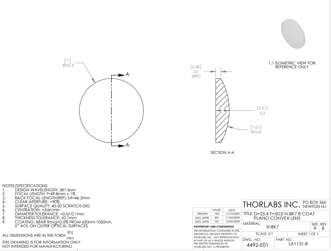 其中n是折射率,R是透镜表面的曲率半径。这些透镜使用阿贝数为64.17的N-BK7材料生产;阿贝数是色散指标。