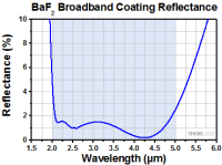 Thorlabs的Ø1/2英寸和Ø1英寸的氟化钡(BaF2)平凸透镜提供双面都镀有宽带增透膜(针对2.0 - 5.0 μm优化)的版本。增透膜明显地减小了基板表面的高反射率,在整个增透膜的区域内提供了超过94%的平均透射率。有关镀膜氟化钡透镜的透过和反射详情,请查看曲线标签。