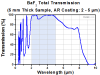 上图所示为镀增透膜的氟化钡平凸透镜样品的透射光谱。蓝色阴影区域表示增透膜的优化区域(2 - 5 μm)。