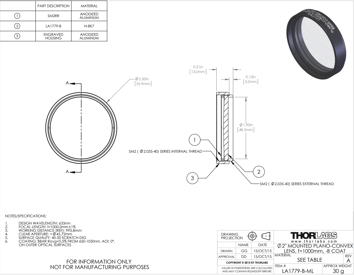 这些平凸透镜由N-BK7材料制造,它是符合RoHS标准的BK7玻璃,并且镀有增透膜,在650 - 1050 nm波长范围上提供每个表面< 0.5%的平均反射率。N-BK7是制造高性能光学元件最广泛使用的光学玻璃之一。当紫外熔融石英的额外好处(即良好的紫外透过率和较低的热膨胀系数)不那么必要时,通常会选择该材料。这些Ø1/2英寸,Ø1英寸、Ø1.5英寸和Ø2英寸的透镜分别安装在兼容SM05 -(0.535"-40),SM1-(1.035"-40)、SM1.5(1.535"-40)和SM2-(2.035"-40)螺纹的安装座上,从而兼容我们的SM螺纹透镜套管。每个透镜套筒都刻有型号,透镜类型,焦距和指向透镜弯曲表面的箭头,以及增透膜范围。