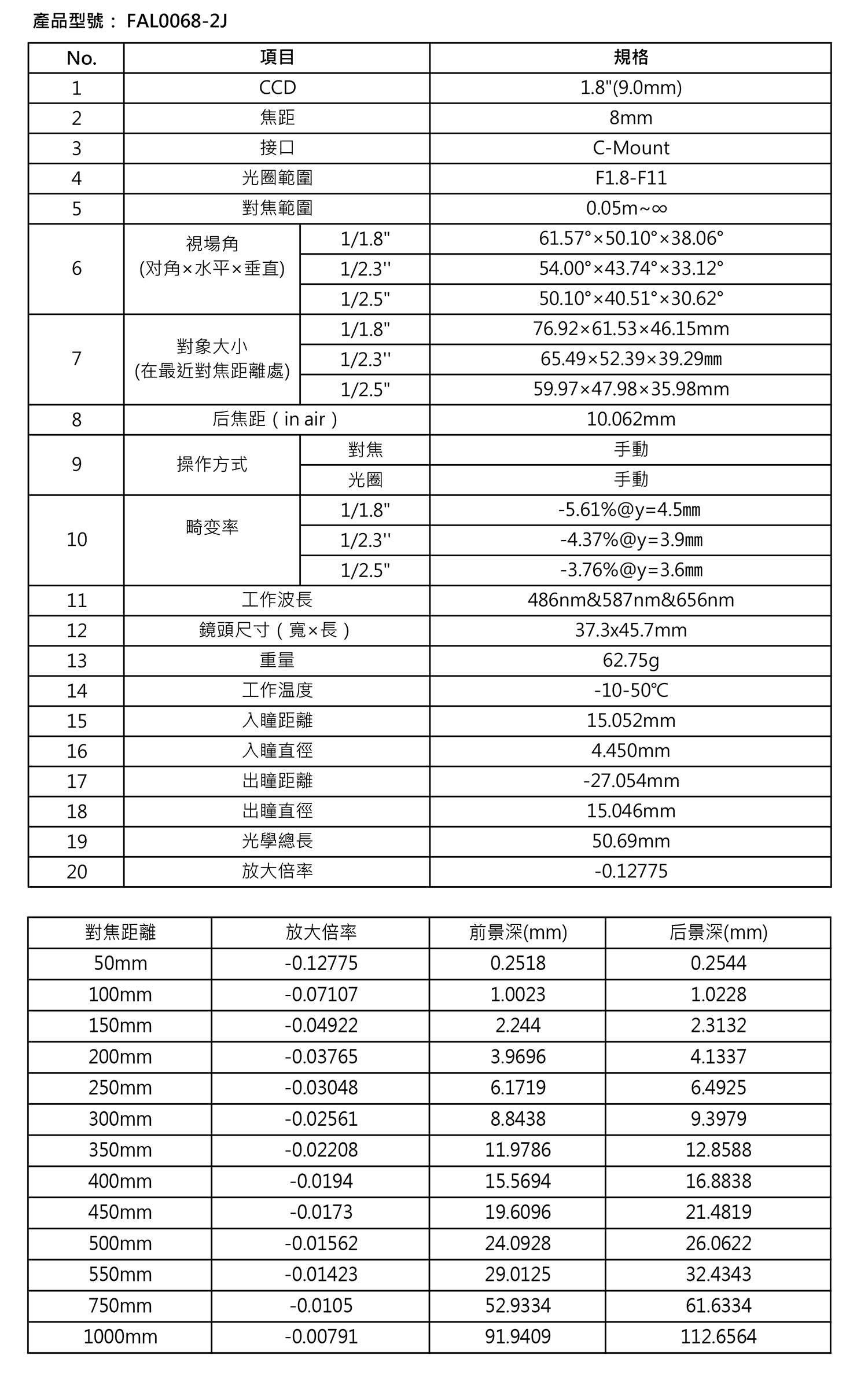 HUAGUO华国 FAL0068-2J FA镜头