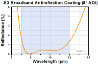 E3 AR膜的反射率与波长的关系图。这种膜在7 - 12 μm波长范围内的平均反射率< 1%,绝对反射率< 2%,如图中的蓝色阴影区域所示。请注意,此波段之外的反射率是典型值,因产品批次不同可能有所差异;波段之外的反射率波动或斜坡区域尤其如此。