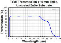 未镀膜的硒化锌在600 nm - 16 µm透射,可理想应用于红外波段。由于它在可见光谱的红色部分的宽传输带及低吸收率,硒化锌一般用于与二氧化碳激光器结合使用的光学系统中,运行在(便宜的氦氖准直激光器可得到)10.6 µm波段下。它也经常用于热成像系统中。与锗和硅不同,硒化锌传输可见光,因此允许视觉光学准直,然而,它质地非常软,易被刮伤。硒化锌在10.6 µm波长时折射率为2.4。关于硒化锌的额外详细信息,请查看光学基底页面。