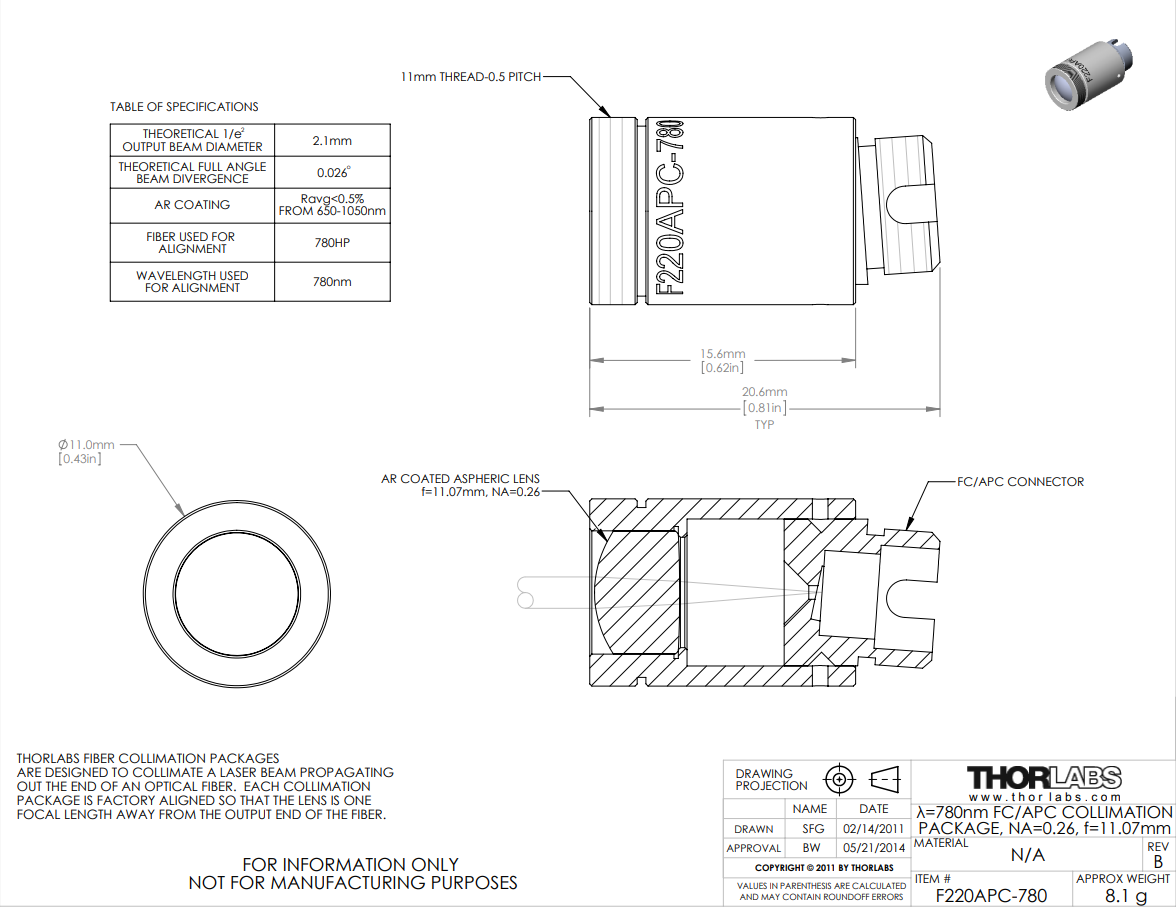 Thorlabs索雷博 F220APC-780 定焦准直器