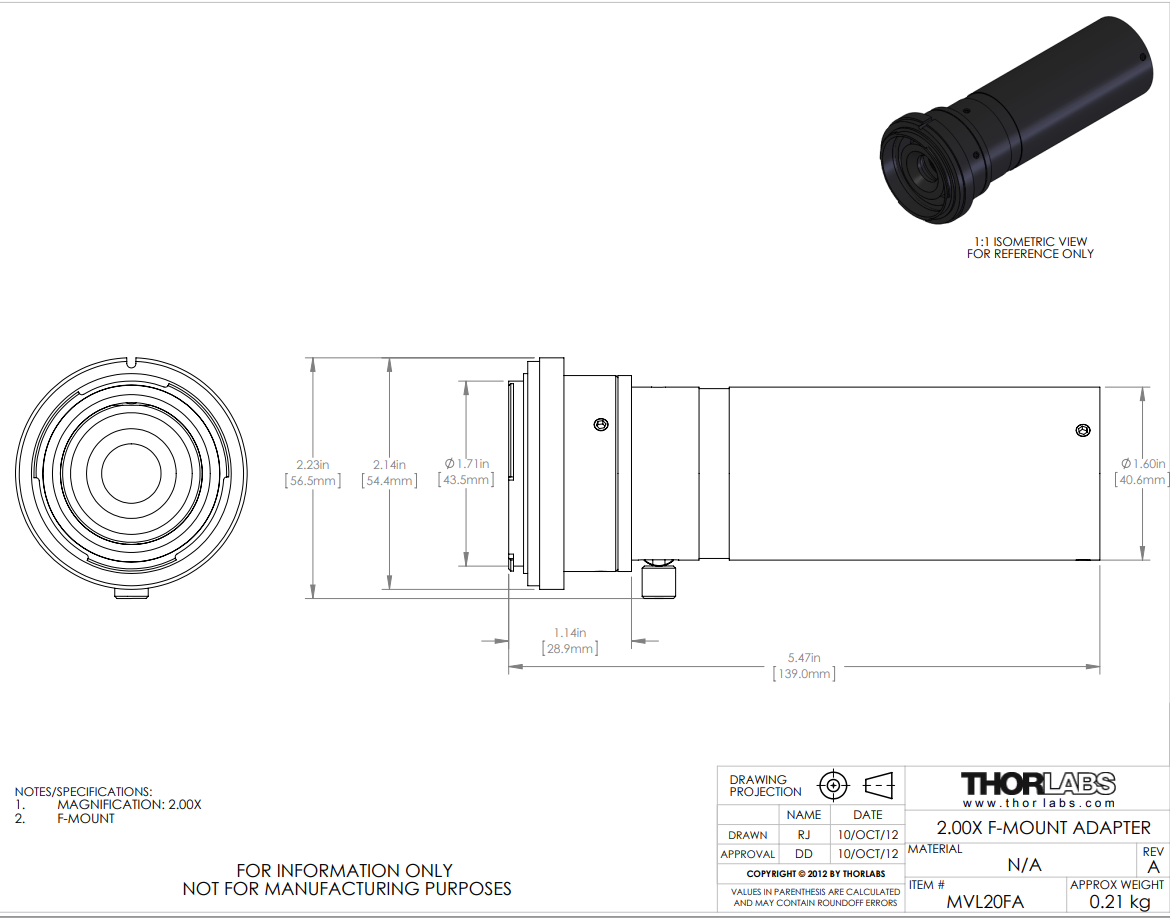 MVL20FA - 2.00X延长套筒,用于6.5X和12X变焦镜头,带F-Mount卡口安装座