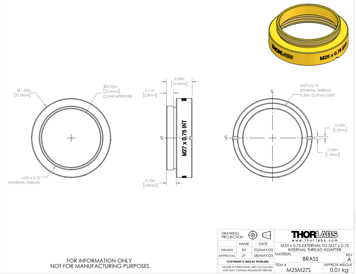 Thorlabs索雷博 M25M27S 显微镜物镜螺纹转接件