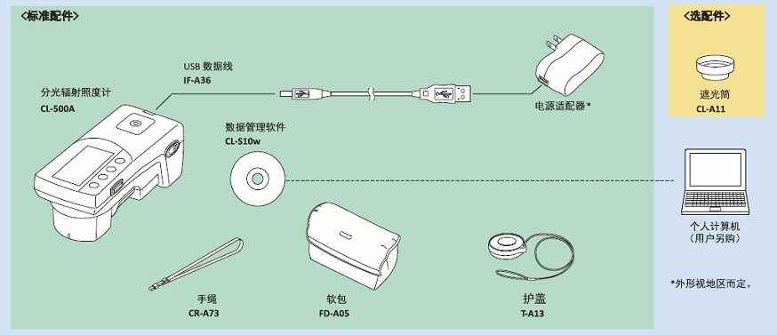 标准配件 | 护盖(T-A13)、软包、USB数据线、电源适配器、手绳、数据管理软件(CL-S10w)、CL-500A专用软件开发工具包(CL-SDK) |