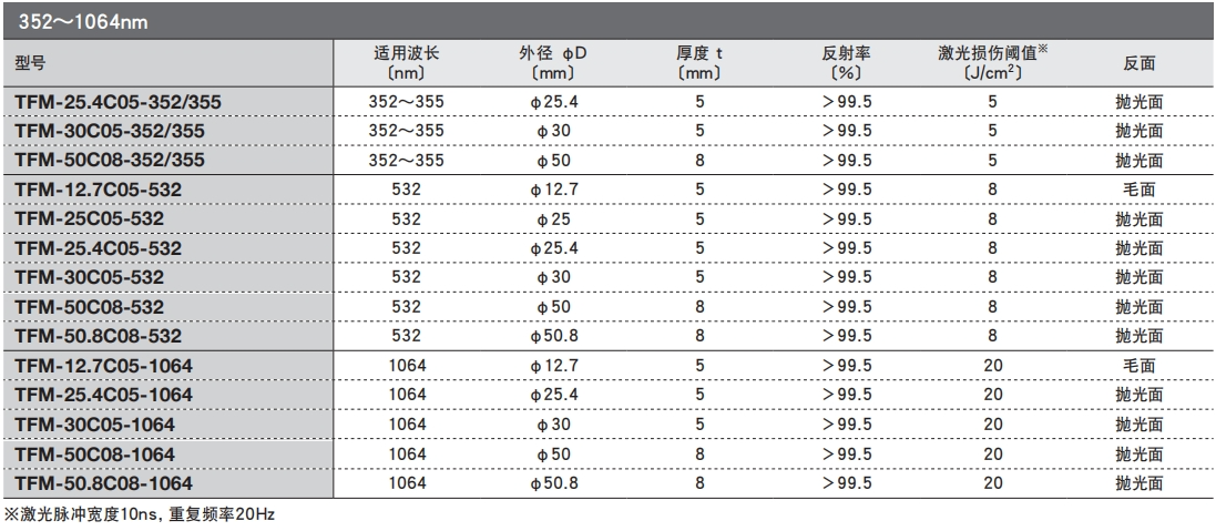 ◦可以提供用于YAG激光器的,从基波(1064nm)到4次谐波(266nm)的反射镜和Ar*F(193nm),Kr*F(248nm)的准分子激光用的反射镜。