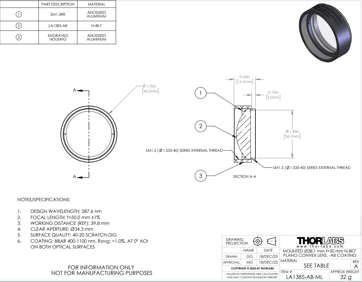 这些平凸透镜由符合RoHS标准的N-BK7材料制成,且镀有增透(AR)膜,在400 nm - 1100 nm波长范围内提供每个表面< 1.0%的平均反射率。N-BK7通常用于不需要紫外熔融石英的高级性能(如在紫外波段的高透过率和较低的热膨胀系数)的应用场合。这些Ø1/2英寸、Ø1英寸、Ø1.5英寸和Ø2英寸的透镜分别安装在兼容SM05(0.535"-40)、SM1(1.035"-40)、SM1.5 (1.535"-40)和SM2(2.035"-40)螺纹的安装座中,从而兼容我们的SM螺纹透镜套筒。SM螺纹卡环用于将透镜固定在安装座中。每个安装座都刻有产品型号、透镜类型、焦距、指向透镜曲面的箭头以及增透膜范围。