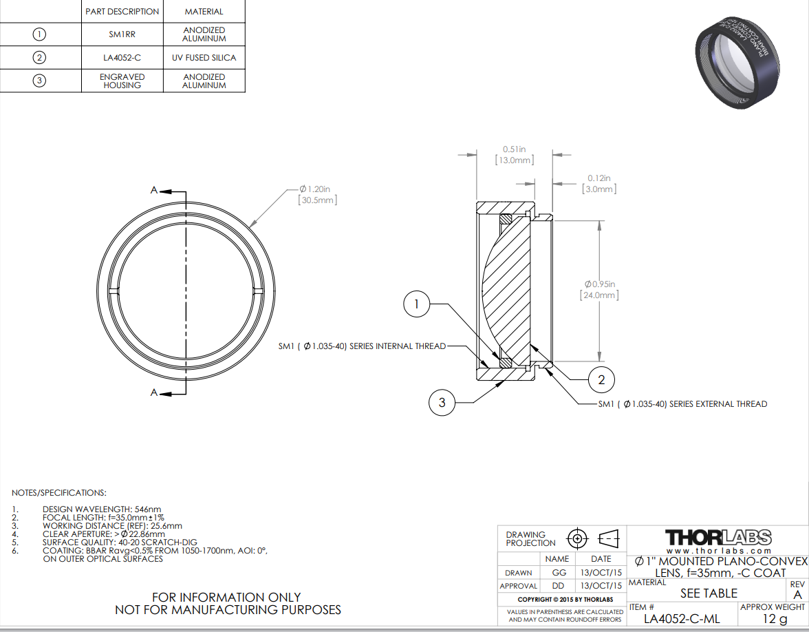 Thorlabs索雷博 LA4052-C-ML 紫外熔融石英平凸球透镜