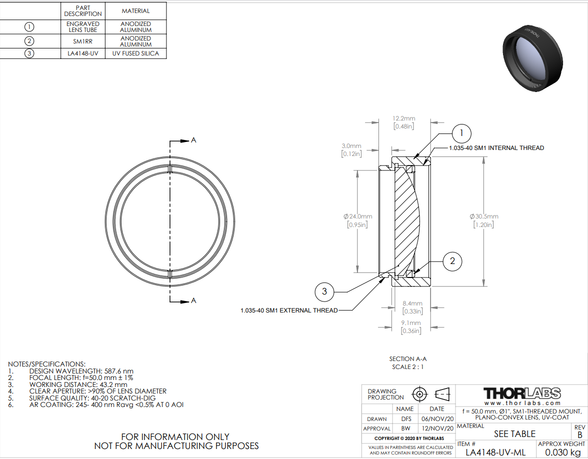 透镜直径 | Ø1/2" 螺纹安装座(SM05螺纹规格) (0.535"-40) SM1-螺纹接口中的"Ø1" (1.035"-40) SM2螺纹安装中的Ø2 (2.035"-40) Ø75毫米 SM3螺纹接口 (3.035"-40) |