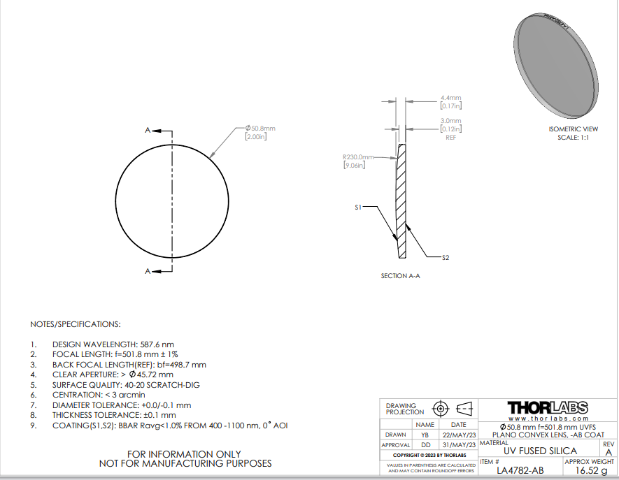 Thorlabs索雷博 LA4782-AB 紫外熔融石英平凸球透镜