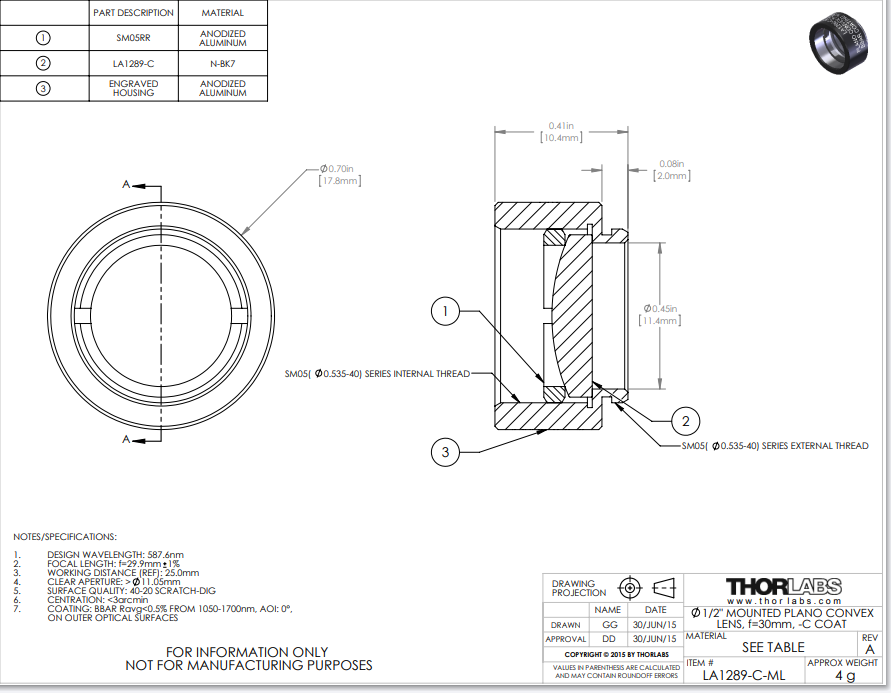 这些平凸透镜由N-BK7材料制造,它是符合RoHS标准的BK7玻璃,并且镀有增透膜,在1050 - 1620 nm或1050 - 1700 nm波长范围上提供每个表面< 0.5%的平均反射率。N-BK7是制造高性能光学元件最广泛使用的光学玻璃之一。当紫外熔融石英的额外好处(即良好的紫外透过率和较低的热膨胀系数)不那么必要时,通常会选择该材料。这些Ø1/2英寸、Ø1英寸、Ø1.5英寸和Ø2英寸的透镜分别安装在兼容SM05-(0.535"-40)、SM1-(1.035"-40)、SM1.5(1.535"-40)和SM2-(2.035"-40)螺纹的安装座上,从而兼容我们的SM螺纹透镜套管。每个透镜套筒都刻有型号,透镜类型,焦距和指向透镜弯曲表面的箭头,以及增透膜范围。