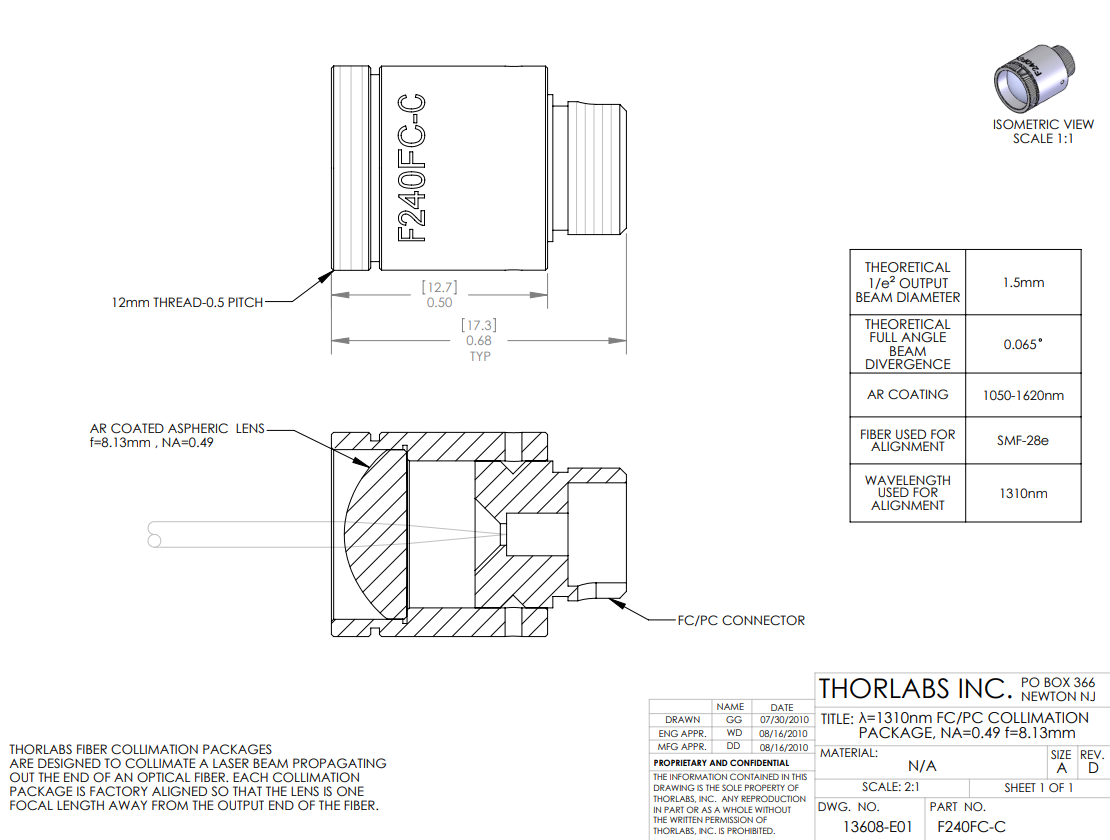 Thorlabs索雷博 F240FC-C 光纤准直器