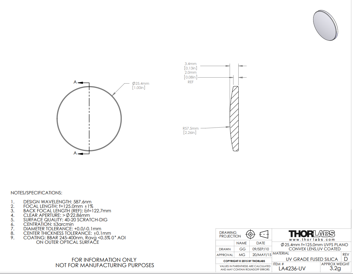 Thorlabs索雷博 LA4236-UV 平凸透镜