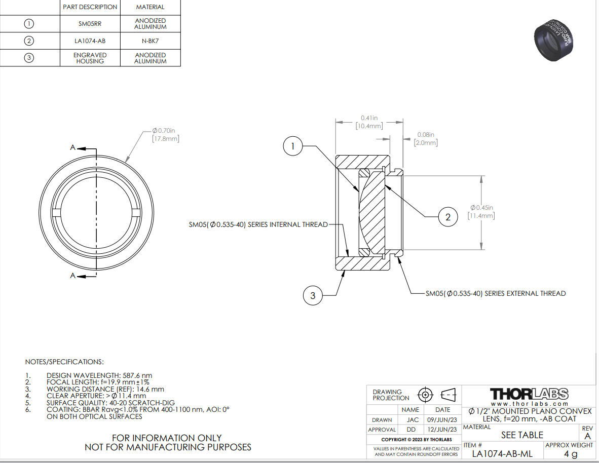 这些平凸透镜由符合RoHS标准的N-BK7材料制成,且镀有增透(AR)膜,在400 nm - 1100 nm波长范围内提供每个表面< 1.0%的平均反射率。N-BK7通常用于不需要紫外熔融石英的高级性能(如在紫外波段的高透过率和较低的热膨胀系数)的应用场合。这些Ø1/2英寸、Ø1英寸、Ø1.5英寸和Ø2英寸的透镜分别安装在兼容SM05(0.535"-40)、SM1(1.035"-40)、SM1.5 (1.535"-40)和SM2(2.035"-40)螺纹的安装座中,从而兼容我们的SM螺纹透镜套筒。SM螺纹卡环用于将透镜固定在安装座中。每个安装座都刻有产品型号、透镜类型、焦距、指向透镜曲面的箭头以及增透膜范围。