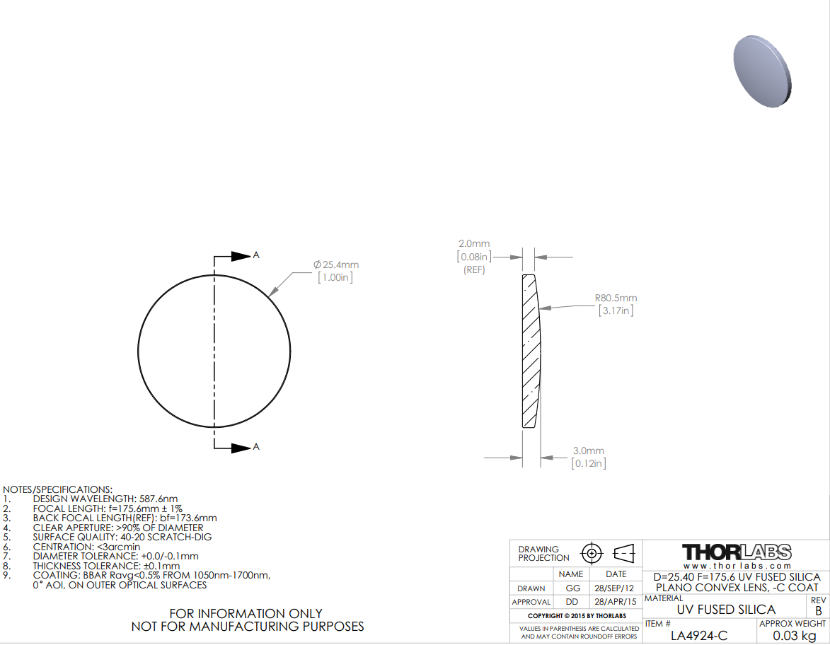 Thorlabs索雷博 LA4924-C 紫外熔融石英平凸球透镜