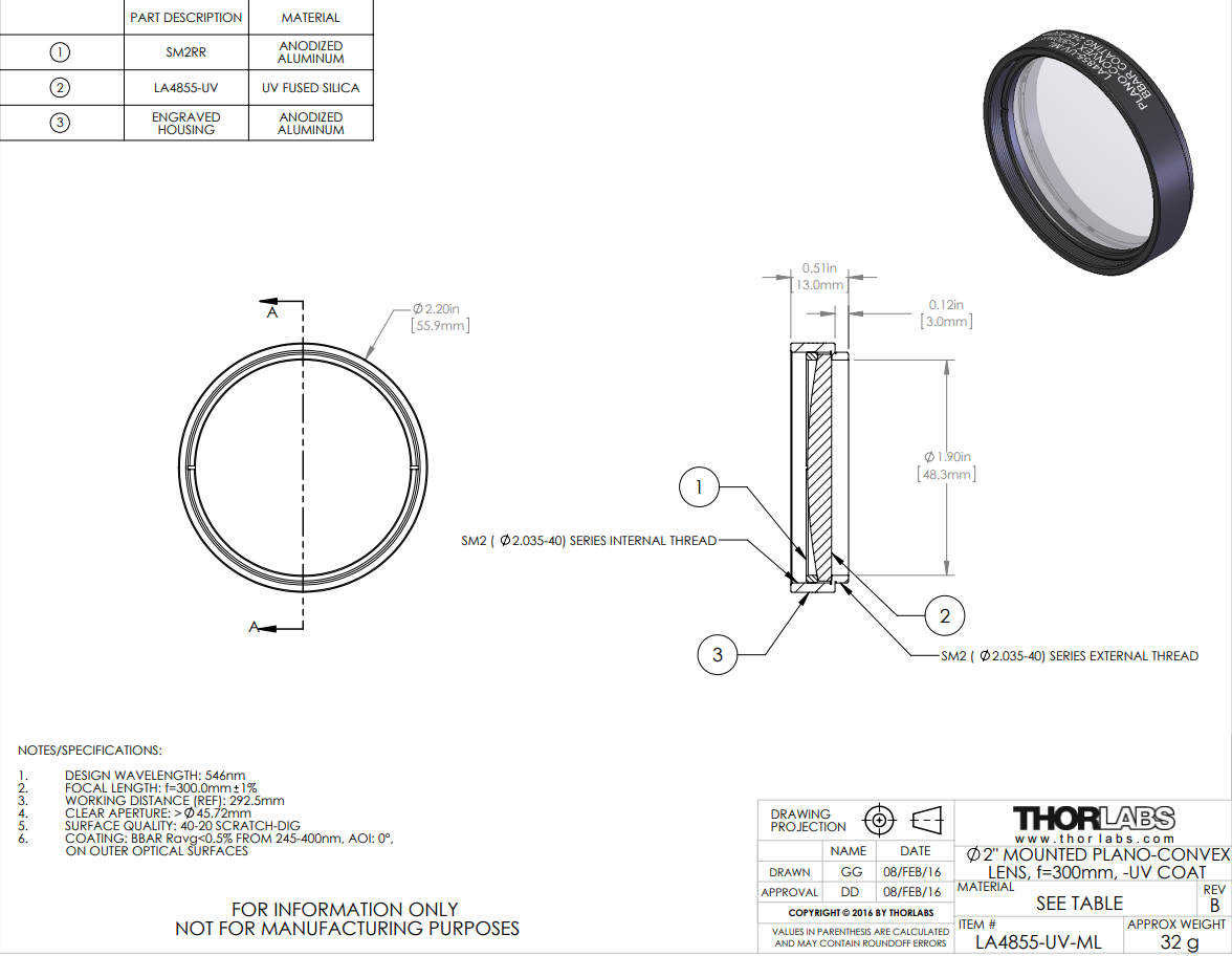Thorlabs索雷博 LA4855-UV-ML 平凸透镜
