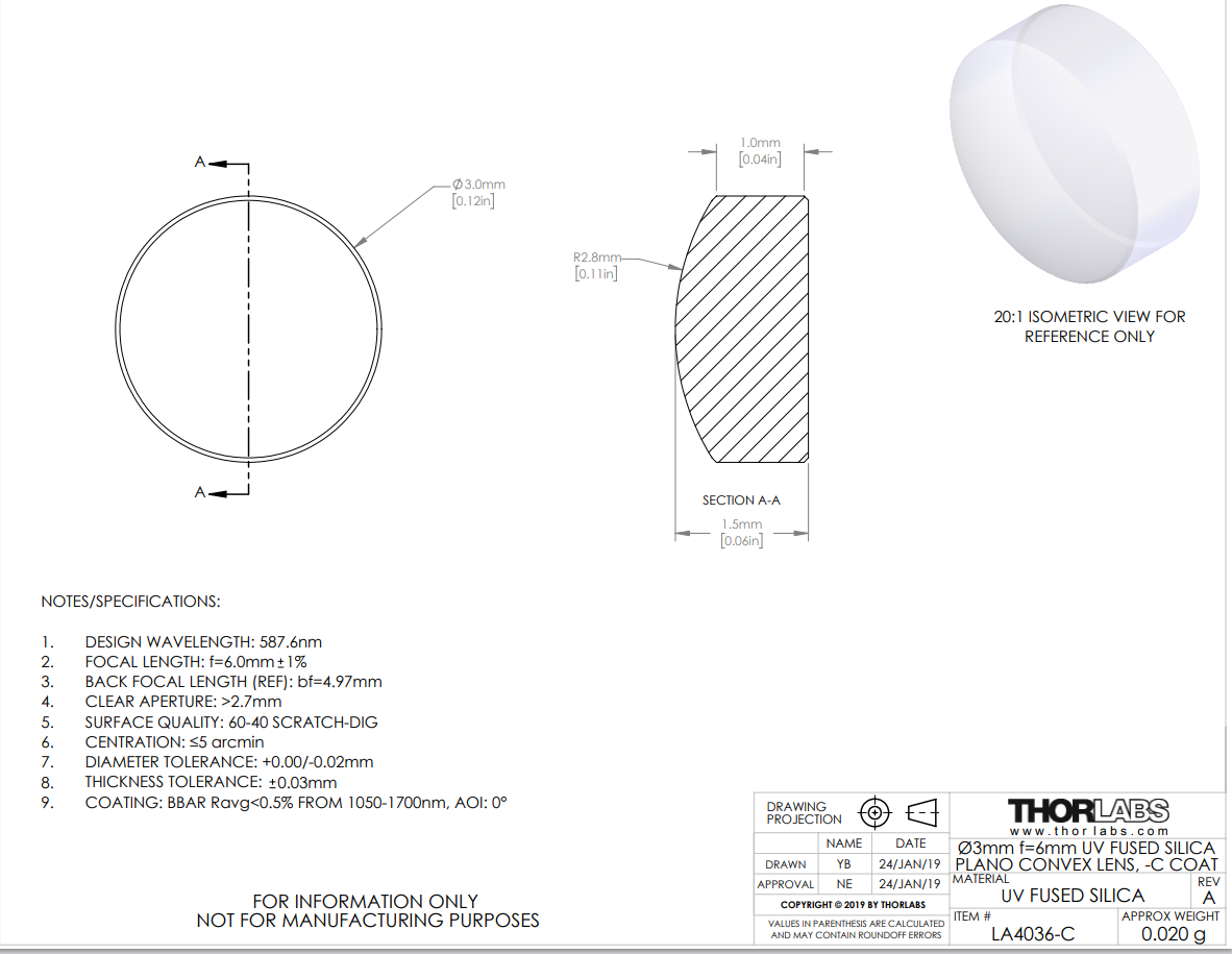 Thorlabs索雷博 LA4036-C 紫外熔融石英平凸球透镜