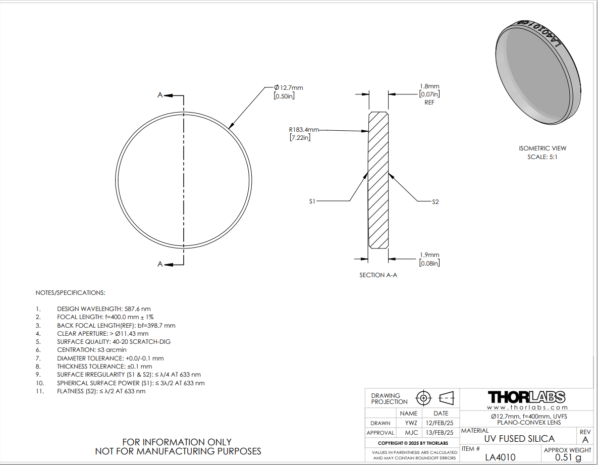 其中,n是折射率,R是透镜表面的曲率半径。这些透镜由阿贝数为67.82的紫外级熔融石英制成;阿贝数是色散指标。