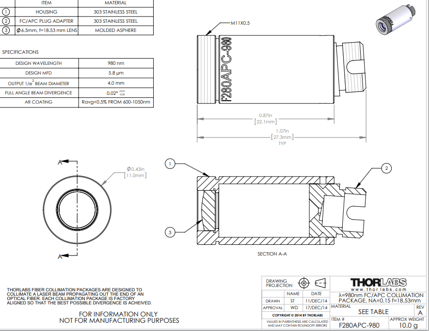 Thorlabs索雷博 F280APC-980 定焦准直器