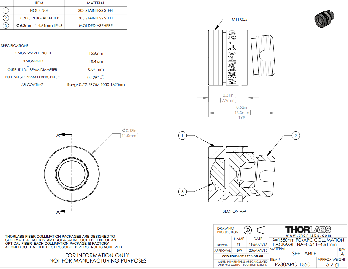 Thorlabs索雷博 F230APC-1550 光纤准直器